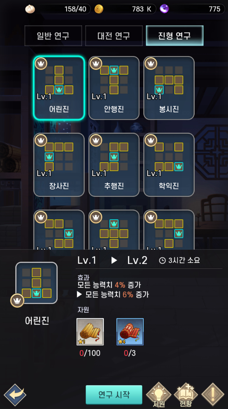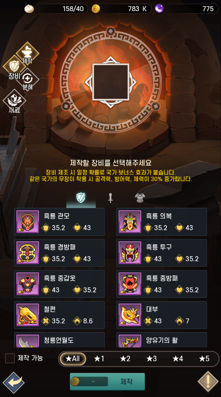 대신 그만큼 육성시스템은 복잡해지지 않고 하위 영웅을 합쳐서 더 높은 별급 장수를 만들거나 대장간을 통해 장비를 제작하고 각종 패시브 능력을 연구하는 정도에 신경을 쓰면 됩니다. 그 외에는 각 장수들의 레벨업 및 스킬만 따로 관리하면 되는데, 레벨업 등의 추가 시스템이 없는 데다 육성시 사용한 재화를 모두 돌려받을 수 있는 기능도 있어 이런 부분에 너무 큰 스트레스를 받을 필요가 없어 보였습니다.