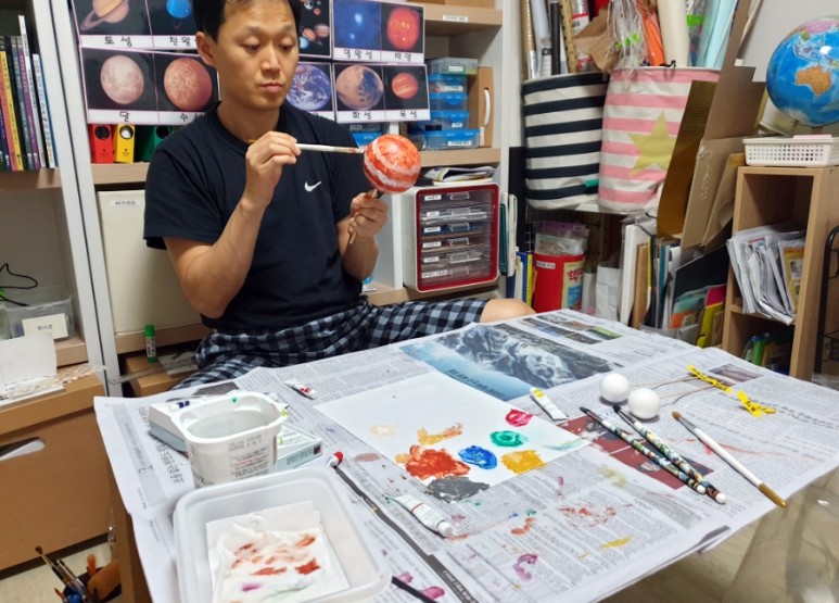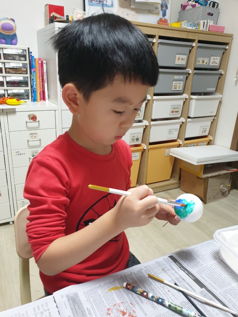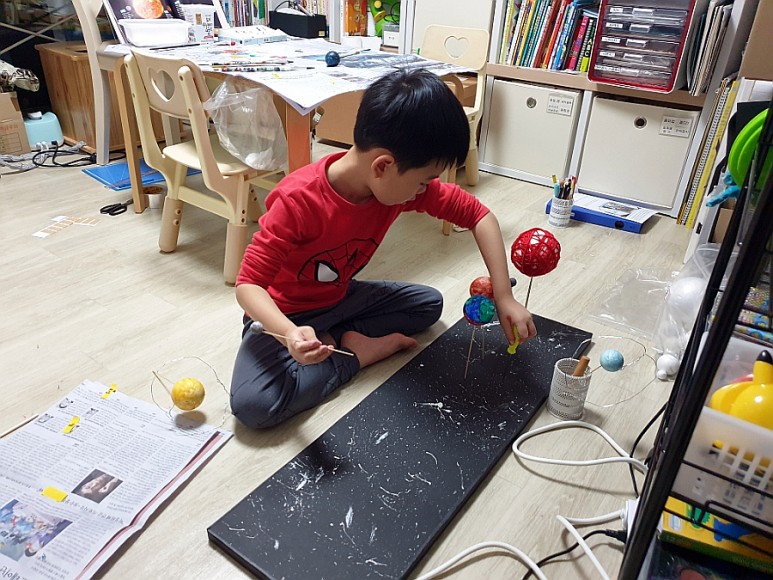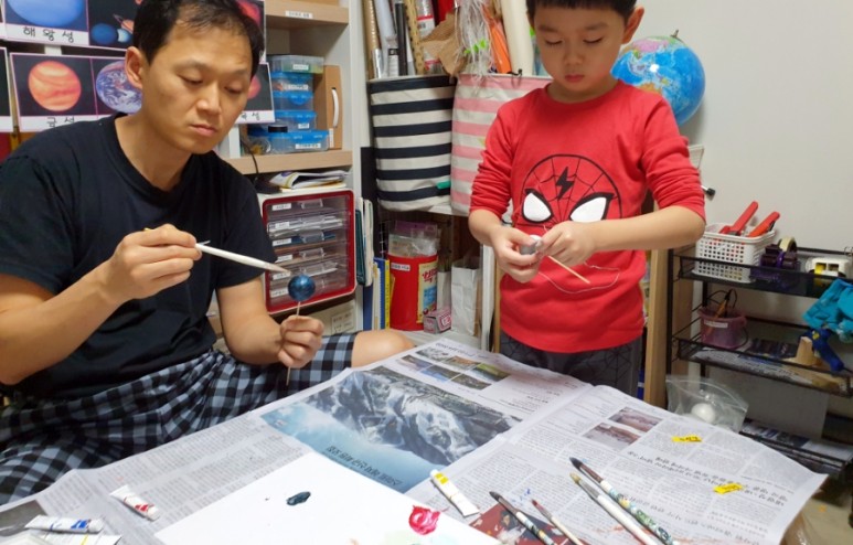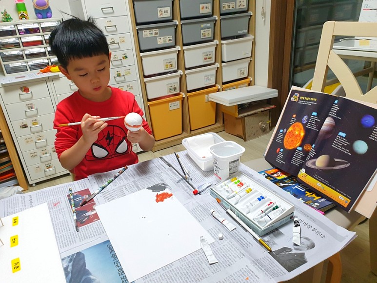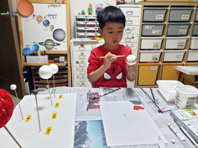 4. “아크릴 물감으로 행성을 칠하다” – 각 행성의 특징을 살려 아버지와 함께 색칠놀이.목성은 남편이 칠했습니다만 ♥ 먼지대 표현점에 100점을 ♥ 토성은 아들이 칠했습니다만… 철사로 고리를 표현한 점에 또 100점을 ♥ + 저는 옆에서 뒷정리 담당이니까…. 다음 단계 준비 중!