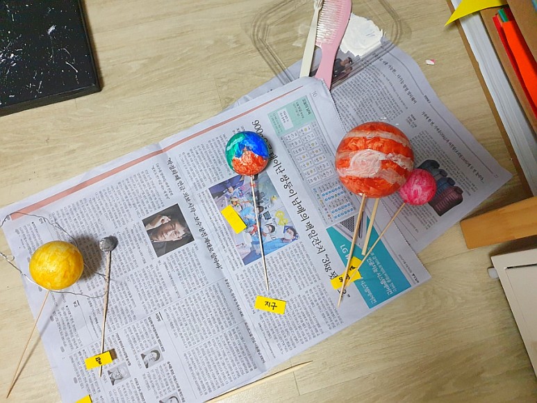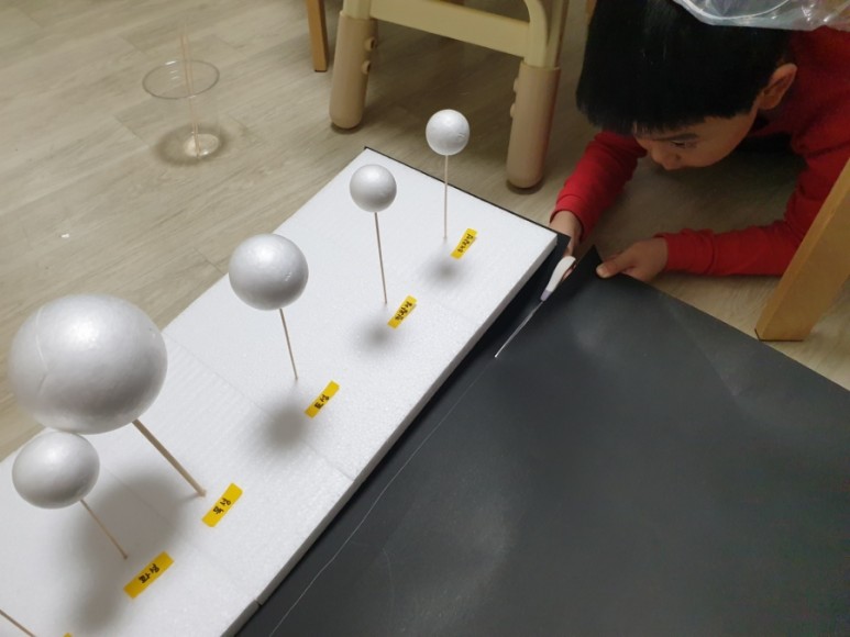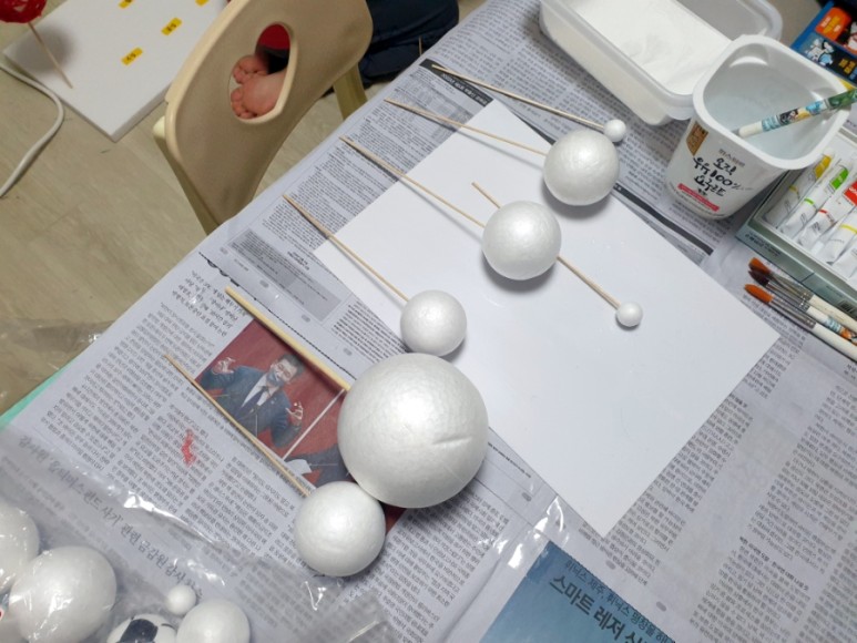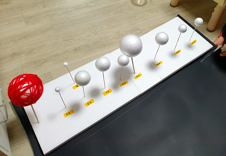 2. “각 행성별로 스티로폼 크기를 정해 행성픽 꽂기” 물금지 (월) 화목토천해 – (재료구매 – 스티로폼공 : 알파문구 / 꼬치 : 다이소) (긴 스티로폼 : 택배올 때 보관해둔 것)