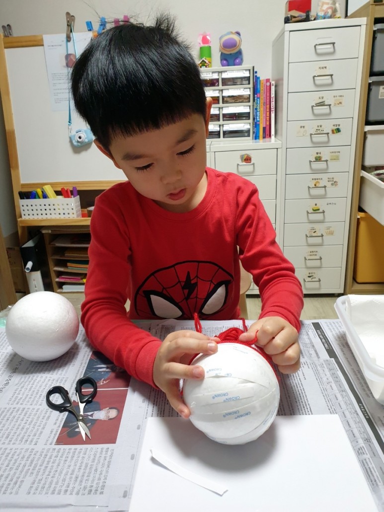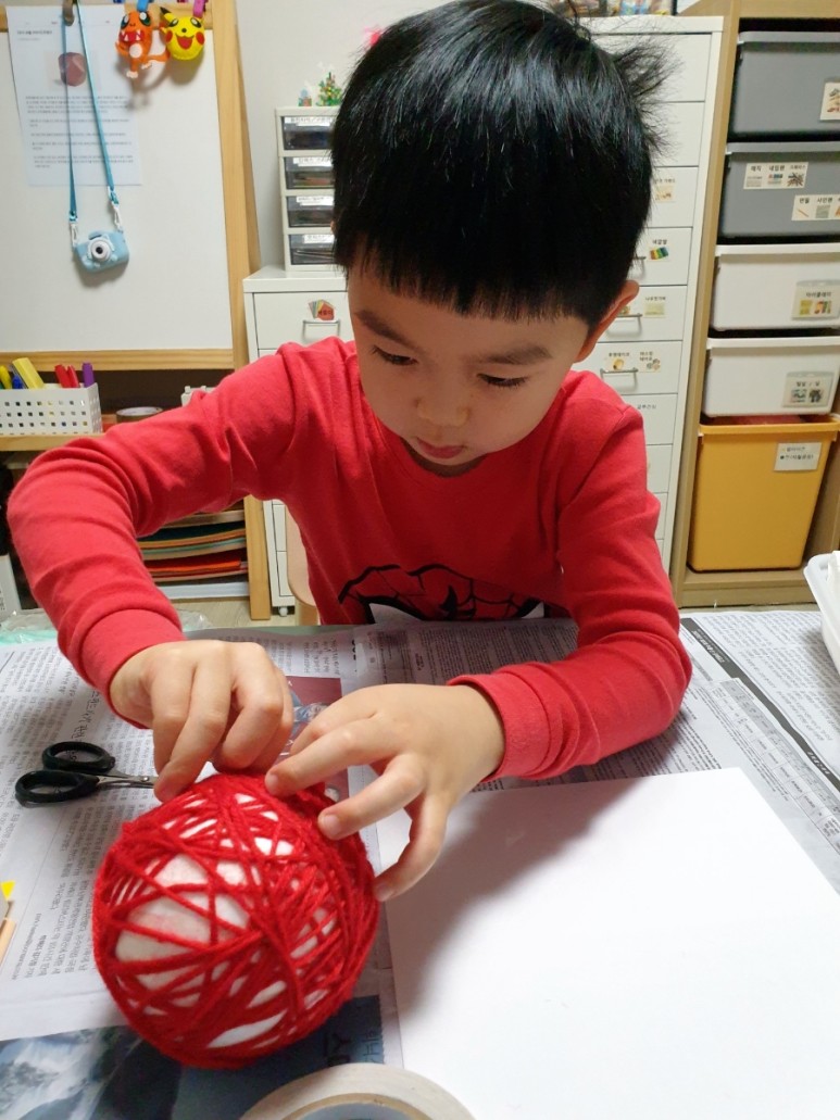 (작업과정) 태양계행성모형만들기 #solar system #maker1. “태양만들기” 스티로폼볼에 양면테이프를 붙이고 붉은 털실로 둘둘 감아있다.