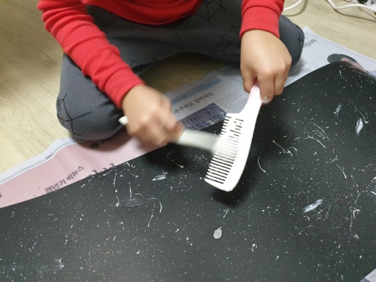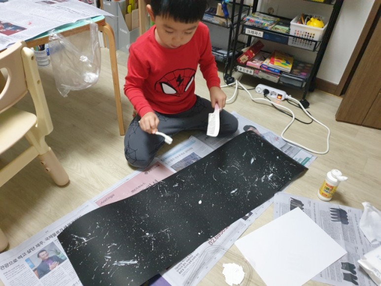 3. “긴 스티로폼에 붙이는 <우주의 배경> 만들기” – 검은 대형 전지를 긴 스티로폼 크기로 자른 후, <빗+흰 물감+칫솔>로 반짝반짝 빛나는 우주의 배경을 장식한다.