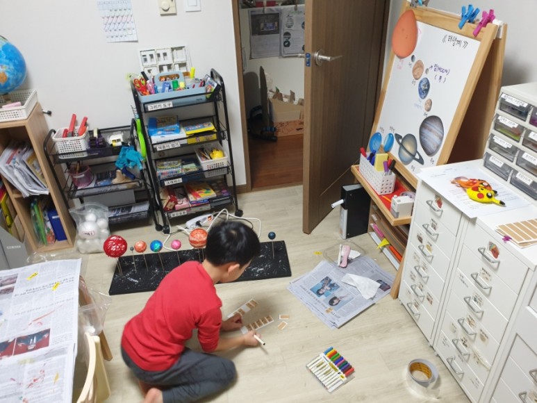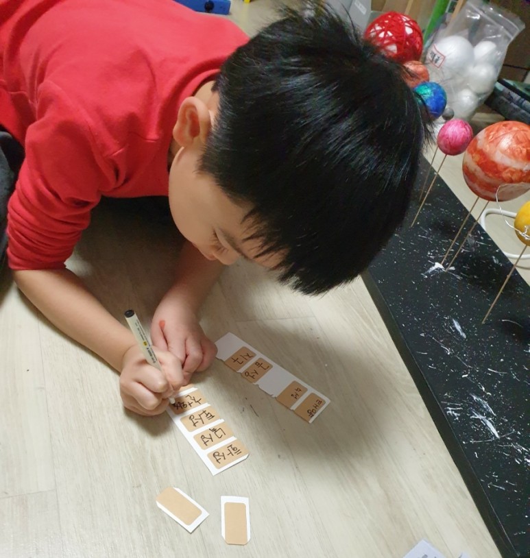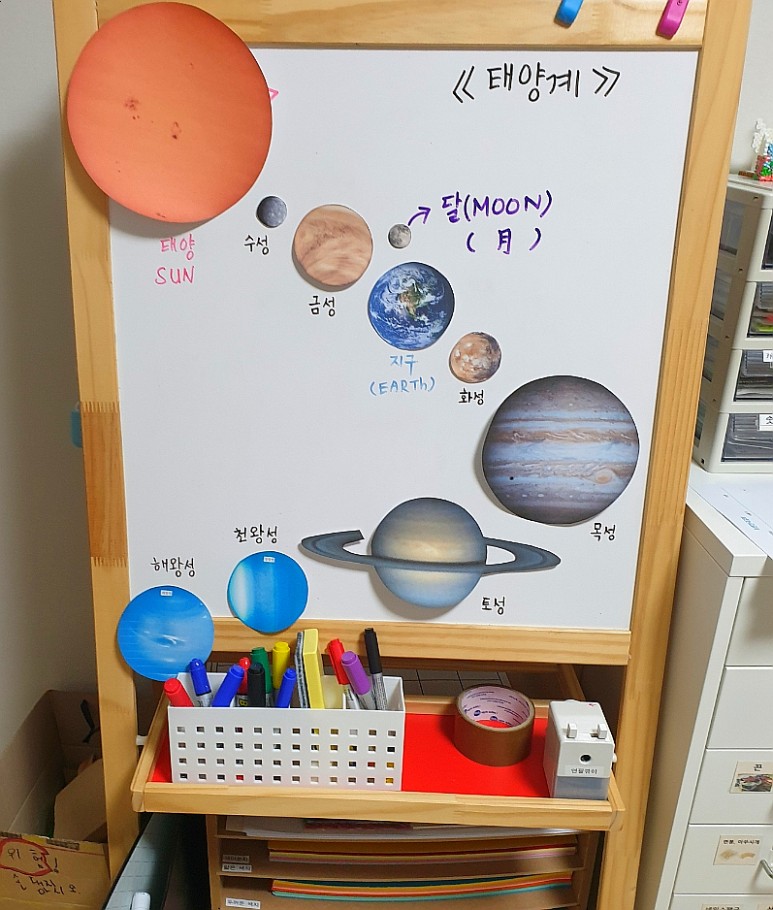 6. “서랍지에 행성 이름 쓰고 붙인다” – 나는 프린트해서 예쁘게 붙여줬으면 했는데 아이가 직접 써서 붙여놓으니까 더 멋지다.(역시… 날로 아이의 생각이 빛나는 경우가 많은 것 같다.)♥ )