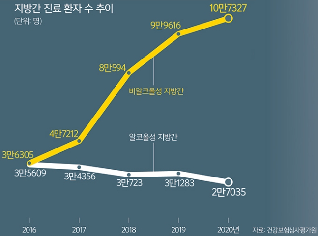 건강보험심사평가원 통계에 따르면 알코올성 지방간 환자는 2016년 3만5609명에서 2020년 2만7035명으로 감소한 반면 비알코올성 지방간 환자는 2016년 3만6305명에서 2019년 10만7327명으로 증가했다.