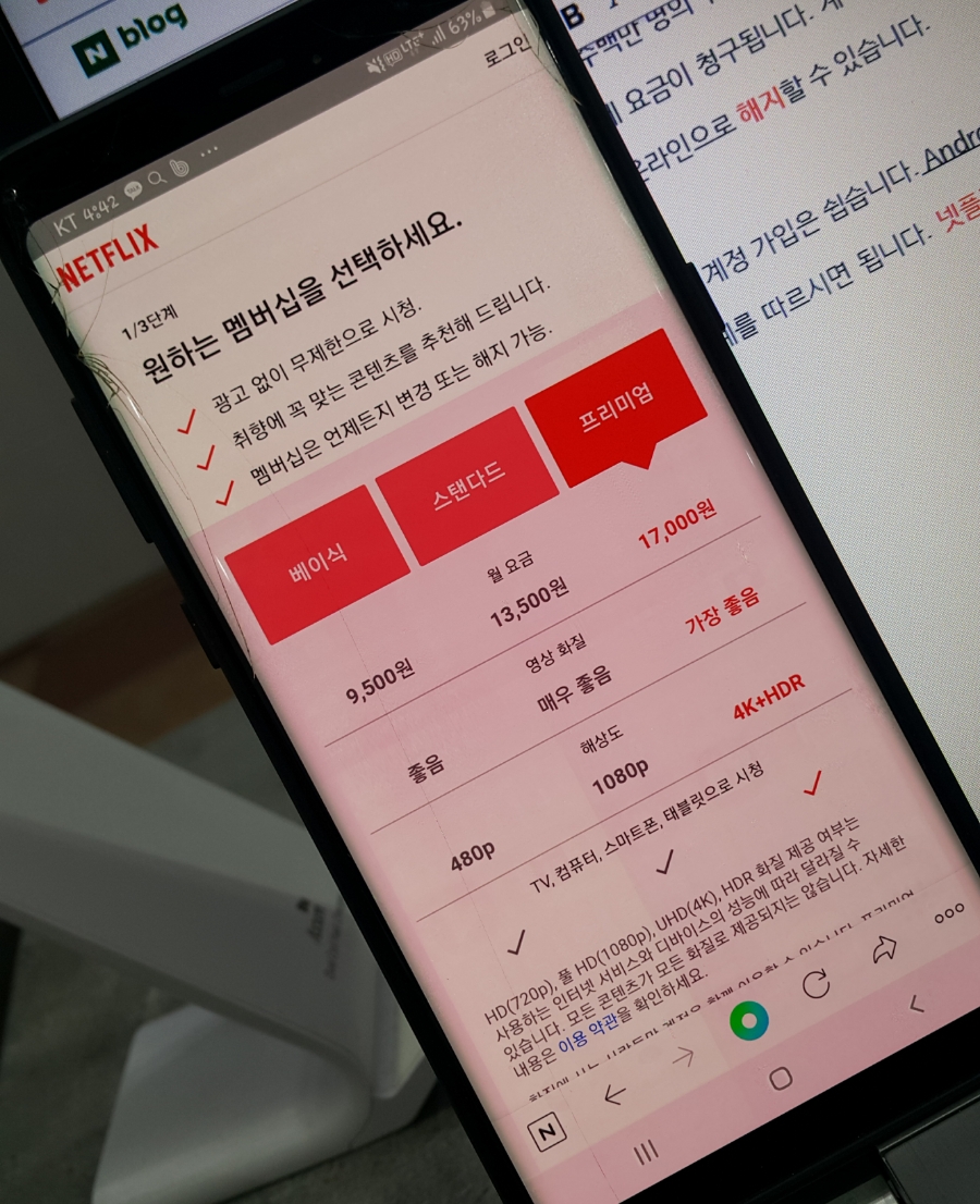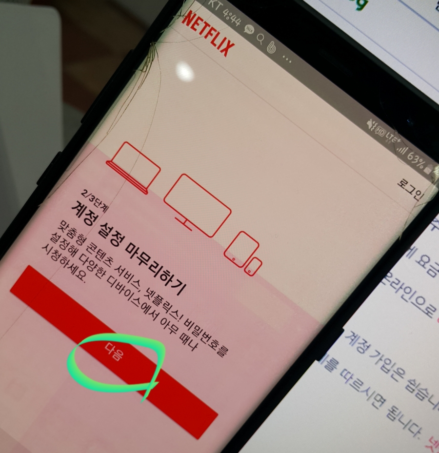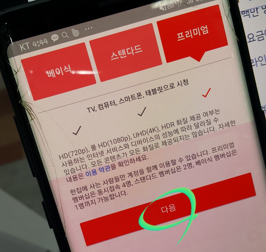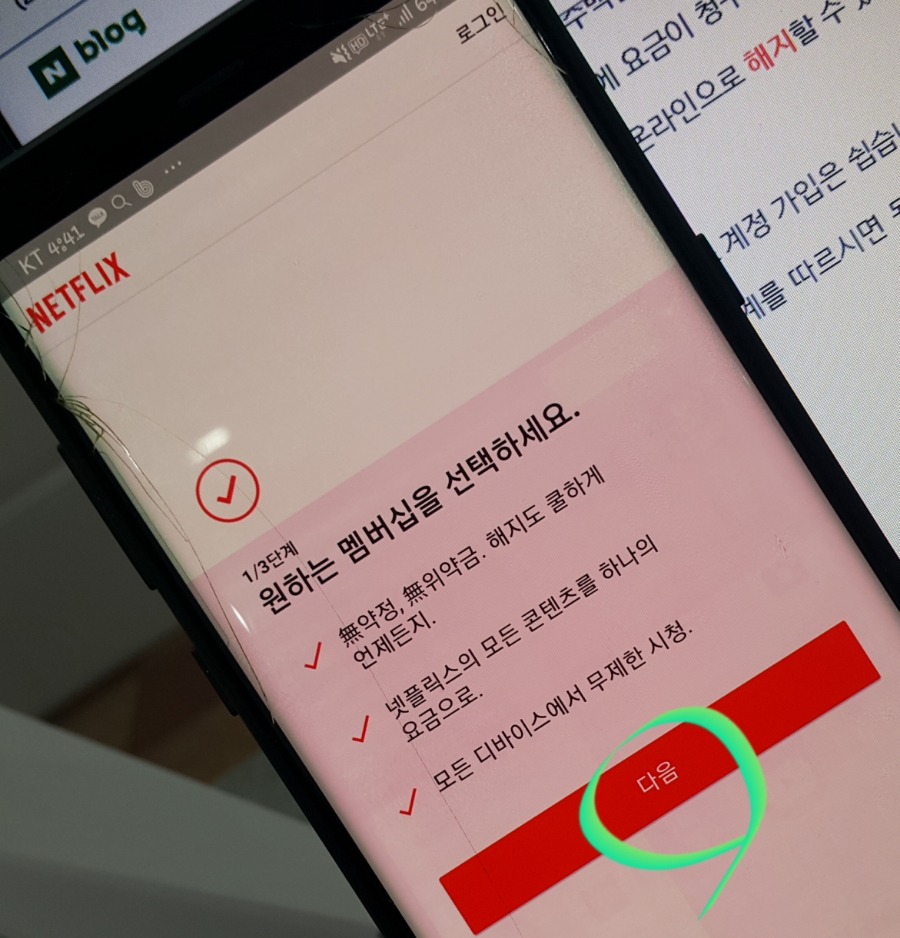 1/3단계 원하시는 멤버쉽을 선택해주세요.V 무약정, 무위약금, 해지도 쿨하게 언제든지.브이넷플릭스의 모든 콘텐츠를 하나의 가격으로.V모든 디바이스에서 무제한 시청.아래에 보시면 다음 빨간 버튼이 있는데 터치해서 눌러요.