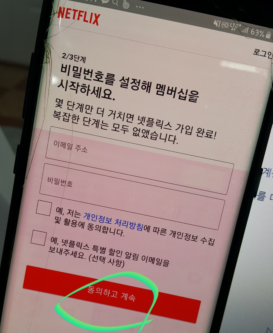 2/3단계 비밀번호를 설정하시고 멤버십을 시작해주세요.앞으로 몇 단계로 넷플릭스 가입 완료! 복잡한 단계는 모두 없앴어요.이메일, 비밀번호 기입 후 개인정보 처리방침에 따른 개인정보 수집 및 활용에 동의합니다.넷플릭스 특별 할인 알림 메일을 보내주세요 (선택사항) 에 (V) 체크하세요.아래 동의 하에 빨간 버튼을 선택해 주세요.
