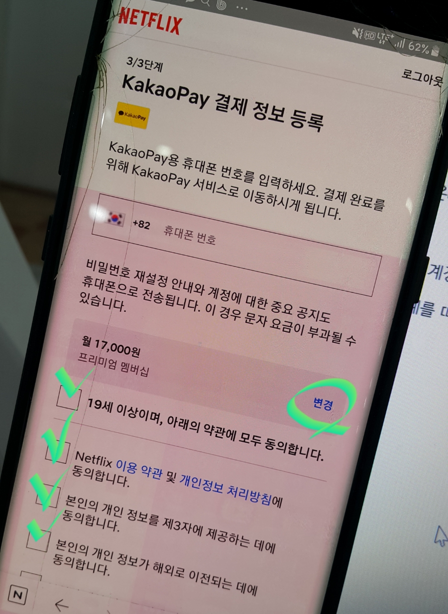 카톡페이 결제정보 등록 카카오페이 휴대폰 번호를 입력해주세요. 결제를 완료하기 위하여 카톡페이 서비스로 이동하겠습니다.휴대폰번호 비밀번호 재설정 안내 및 계정중요 공지도 휴대전화로 전송됩니다. 이 경우 메일 요금이 부과될 수 있습니다.제가 임의로 월 17,000원 프리미엄 멤버십을 설정했는데 우측으로 변경을 터치하면 요금제를 바꿀 수 있습니다.
