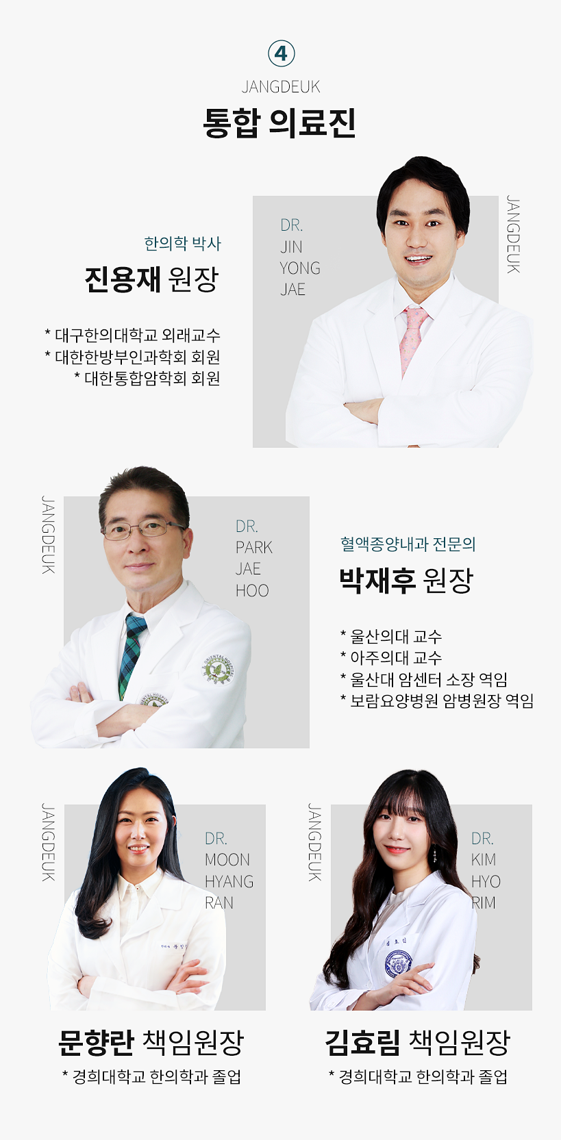 - 장덕한방병원, 면역암센터, 보건복지부에서 지정한 인턴 및 레지던트 한방병원입니다. 한의사간의 협업을 통해 질 높은 의료서비스를 기대할 수 있습니다.
