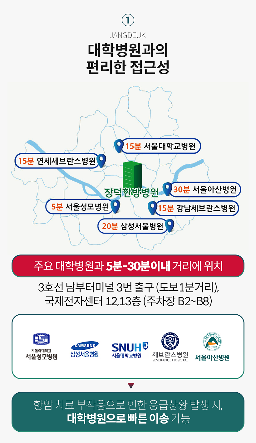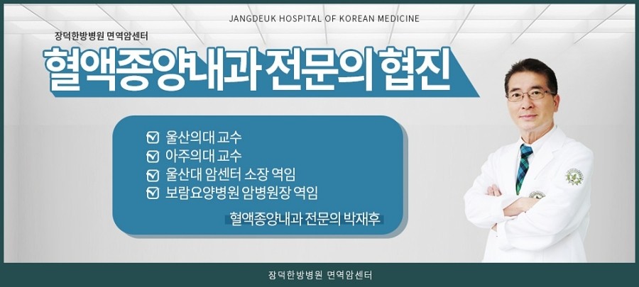 - 2) 장덕한방병원 면역암센터는 암환자의 효과적인 치료와 관리를 통해 집중교육을 받는 인턴과 레지던트 수련생이 24시간 함께 합니다.