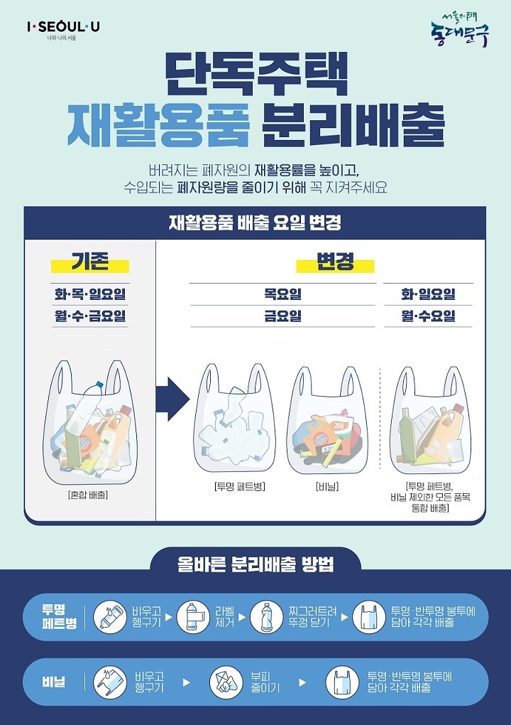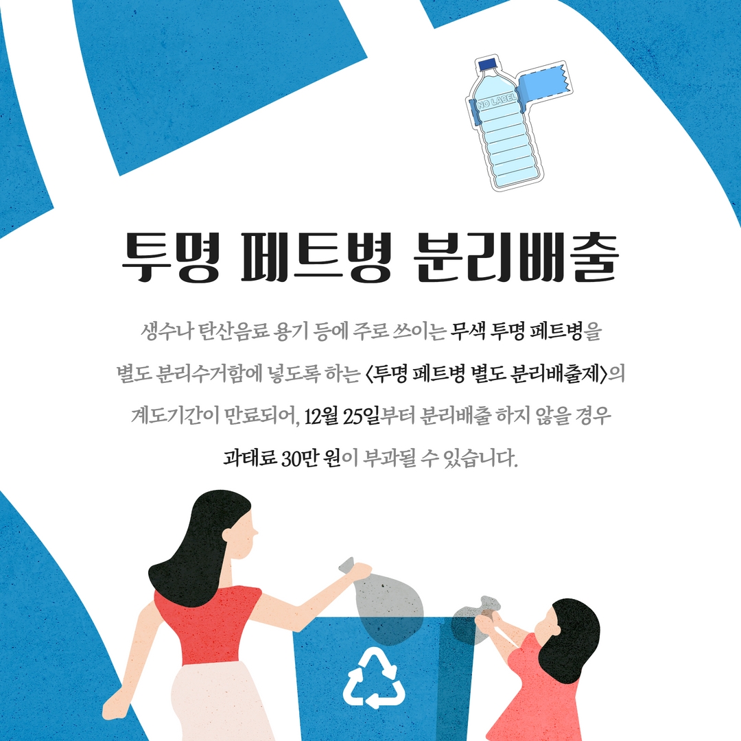 ■ 시행일 – 공동주택 : 2020년 12월 25일부터(투명 페트병 전용 수거함 배출) – 단독 및 상가 : 2021년 12월 25일부터(투명 페트병 전용봉투 혹은 투명봉투에 담아 배출) ■ 배출요일(단독주택 및 상가) – 투명 페트병·폐비닐류 : 주 2일(화,금) – 기타 재활용품 : 주 4일(일,월,수,목)