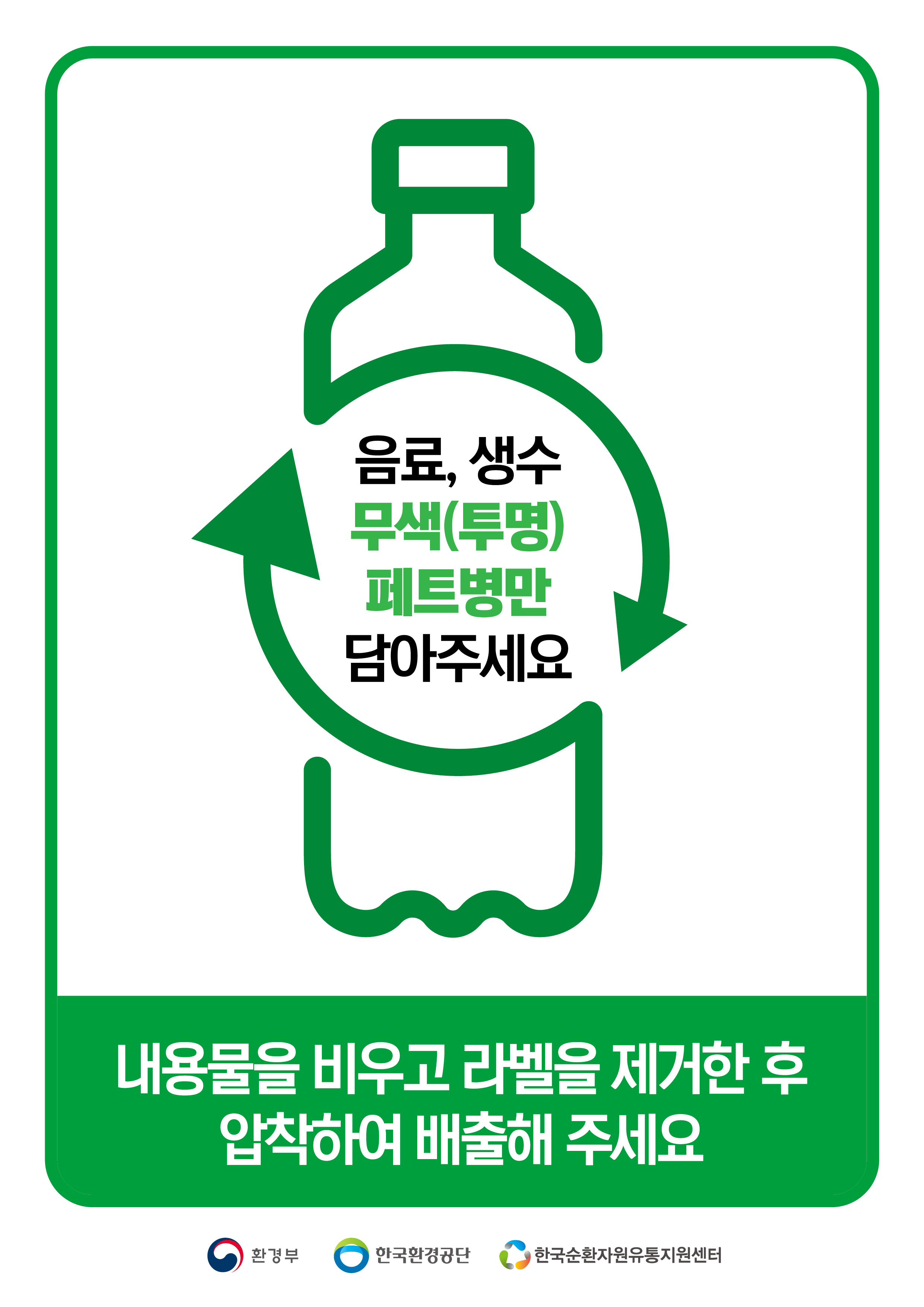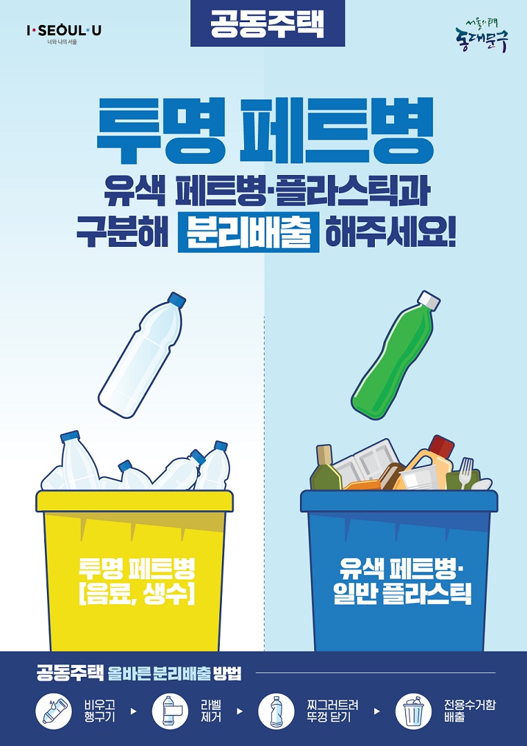 – 폐비닐류: 청결한 비닐류만 투명, 반투명 비닐에 넣어 배출■ 왜 분리수거해서 버려야 할까요?투명 페트병 별도 분리배출로 고품질 국내재생원료 확보→양복 가방 신발 페트병 등 용기로 재생산