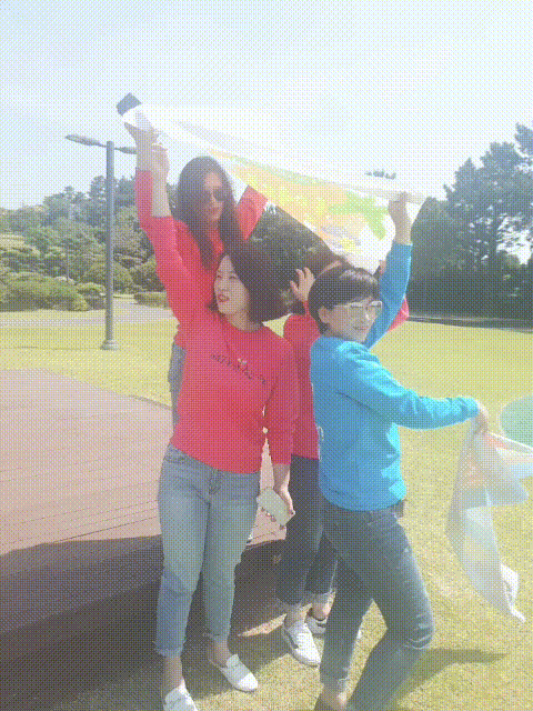 제주도는 굉장히 더웠어요.그래서 다들 이렇게 킥킥 현수밥을 차양으로… 햇빛을 피했어요www