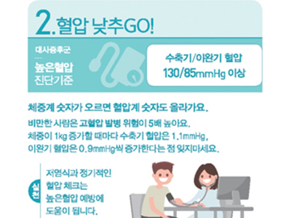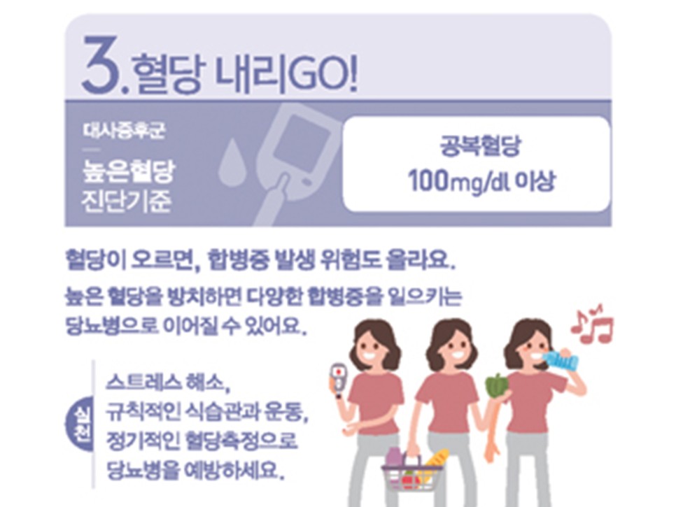 대사 증후군 항목은 복부 비만, 혈압, 혈당, 중성 지방, 콜레스테롤이 있습니다. 위의 항목 중 정상치를 벗어난 항목이 3개 이상이면 대사증후군으로 진단되며 1개 이상의 일시위험군으로 분류됩니다.