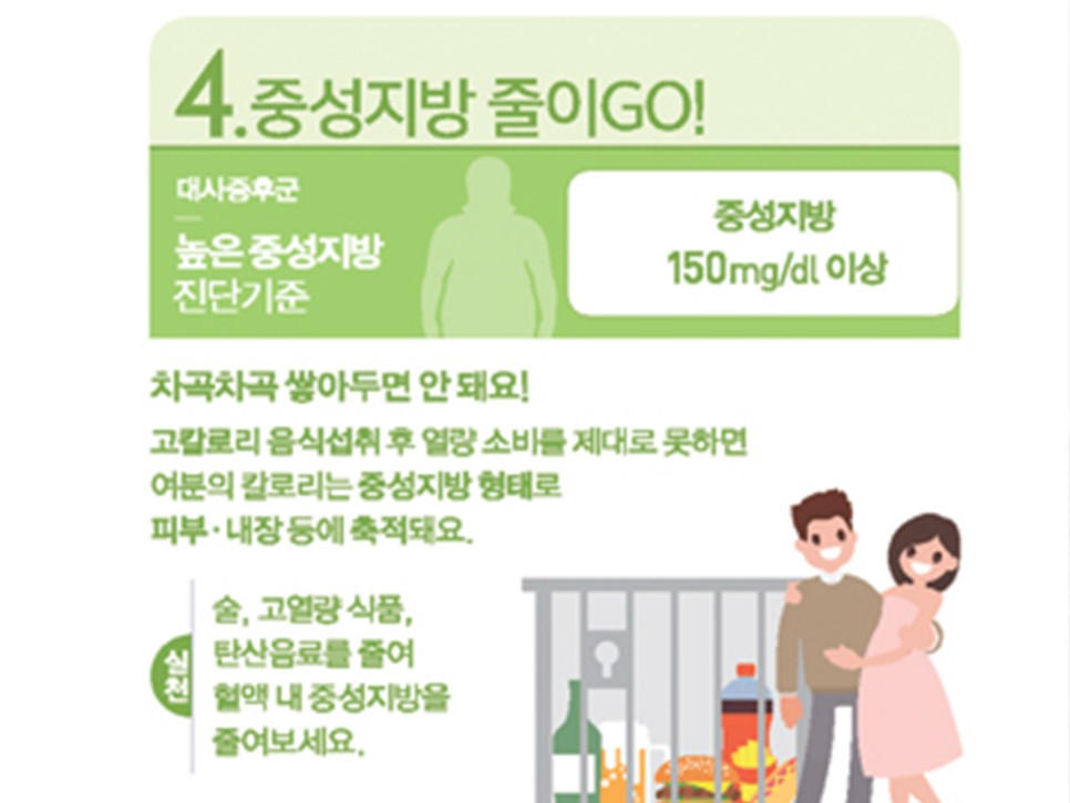 대사증후군이란 단일 질환이 아니라 영양과다, 지방과다, 운동부족 등 다양한 생활습관에서 일어날 수 있는 질환을 모은 지표입니다.