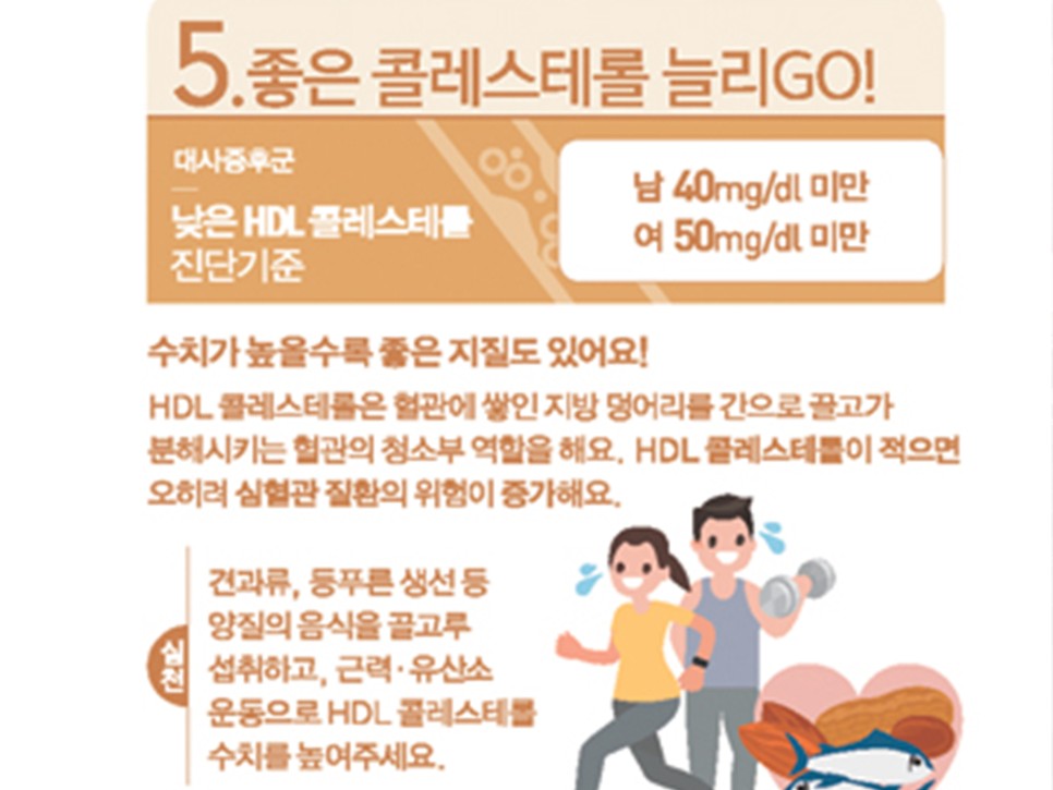 5. 콜레스테롤은 크게 나쁜 저밀도 콜레스테롤(LDL)과 우리 몸에 좋은 고밀도 콜레스테롤(HDL)로 나뉩니다. 고밀도 콜레스테롤은 혈관청소의 역할을 하며 수치가 정상이하일 경우 심혈관 및 뇌혈관 질환, 동맥경화 등의 원인이 될 수 있습니다.