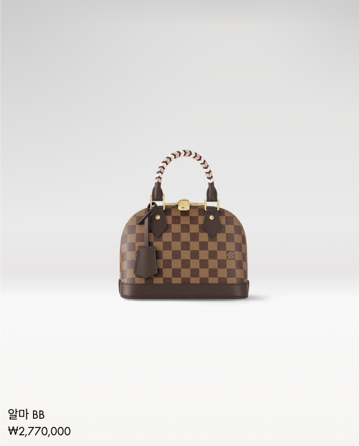 루이비통 알마BB 다미에 에벤가격:2250,000원N41221 무난한디자인의 루이비통백 알마BB의 또다른소재 다미에 에벤입니다.모노그램 소재보다는 조금 더 무게감있고 깔끔한 패턴이 특징이에요!겉은 차분하고 얌전하며 내부는 너무 예쁜 레드컬러 안감이라 더욱 매력적이죠?이 반전매력이 70대 60대 엄마 가방이고 엄마들이 좋아할만한 요소인 것 같아요!