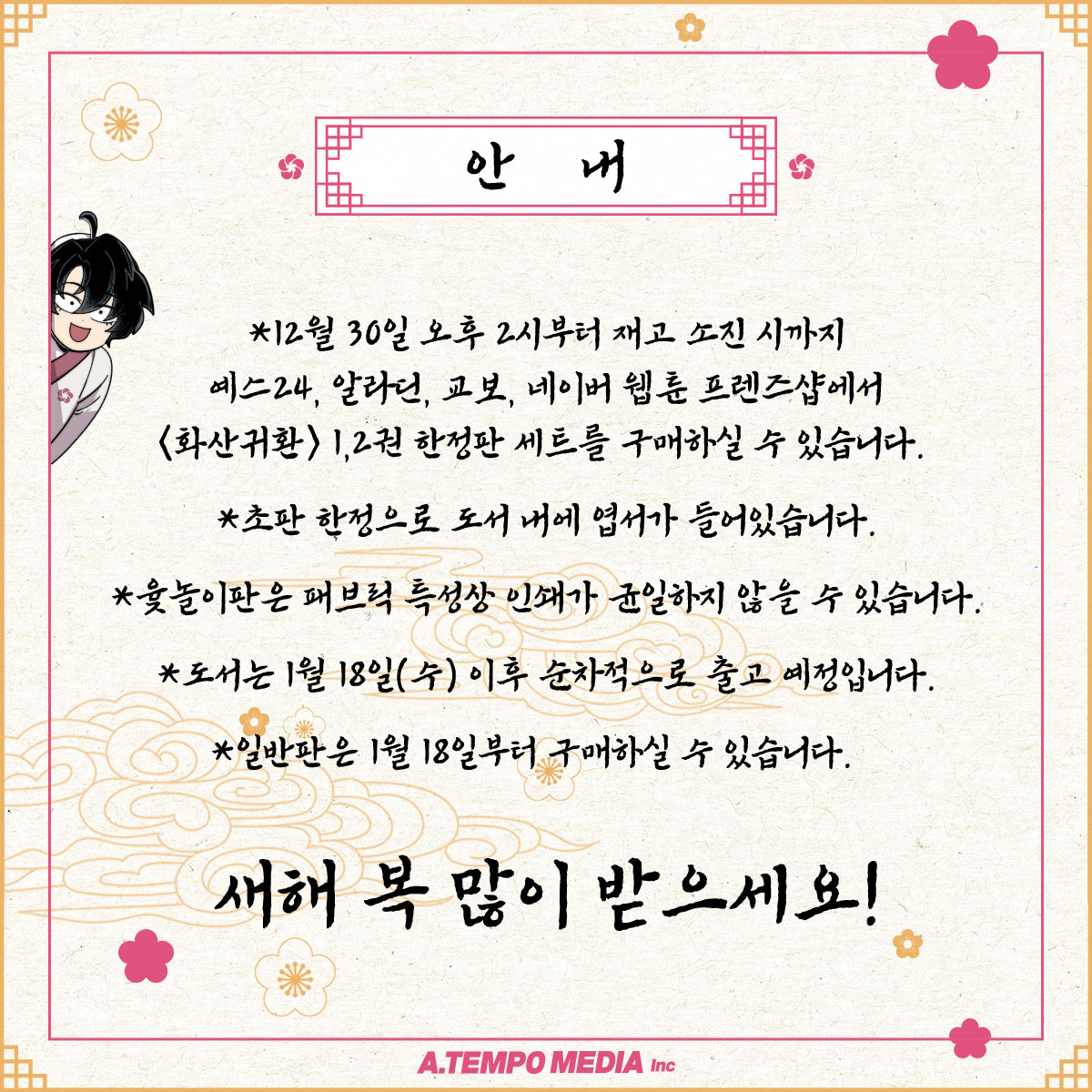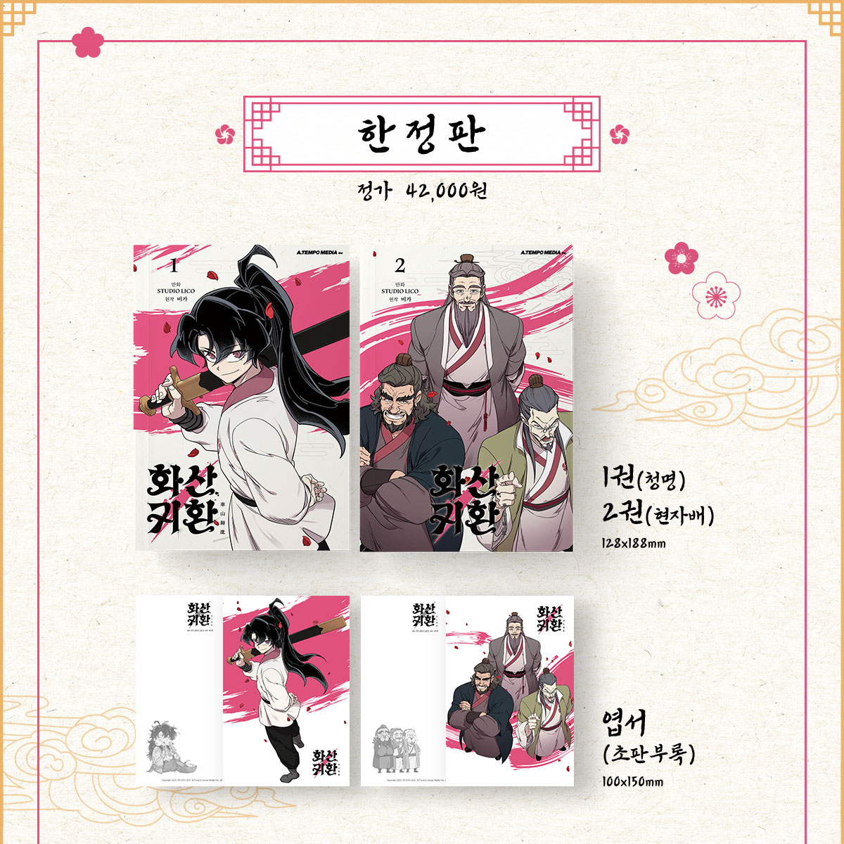 안녕하세요, 에이템포 미디어입니다.1. <화산귀환> 1, 2권 <한정판> 세트는 교보문고, 예스24, 알라딘, 네이버웹툰프렌즈샵에서만 예약판매를 진행하고 있으니 착오 없으시기 바랍니다.2. 한정반과 일반반은 1월 18일 이후 순차출고예정입니다. 3. 현재 온라인 서점 ‘세계의 모든 책’에서 예약 발송으로 판매 중인 상품은 <화산귀환> 1, 2권의 <일반판> 합본이며, 동일하게 1월 18일 이후 순차 출고 예정입니다.4. 일반판 도서는 1월 18일 이후 오프라인 서점을 통해서도 만나보실 수 있습니다.(한정판 도서 오프라인 유통 시 별도로 알려드립니다.) 감사합니다!