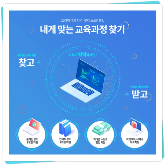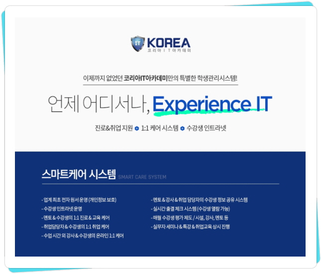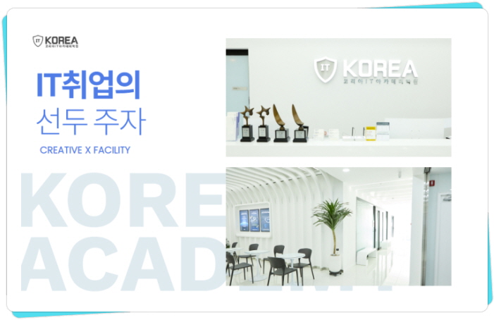 상담을 통해 진로를 결정하고 학습방향을 설정하며 우수한 강사들의 교육으로 코리아 IT아카데미가 성장하고 발전하고 있습니다.IT강국 대한민국, 4차 산업혁명 시대에 IT교육은 선택이 아닌 필수였습니다.코리아 IT 아카데미는 최첨단 시설과 실무자 중심의 강사진으로 IT교육을 선도하고 있습니다.