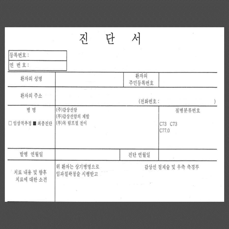 갑상선암(C73) 림프선 전이(C77) 위와 같이 진단서가 발급됩니다.