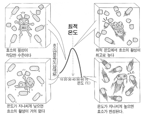 가수분해효소의 작용 ②주성분은 단백질이기 때문에 최적(효소의 활성이 최대가 됨) 상태가 있다. 이는 단백질이 지니는 기본적인 특징이기도 하다.