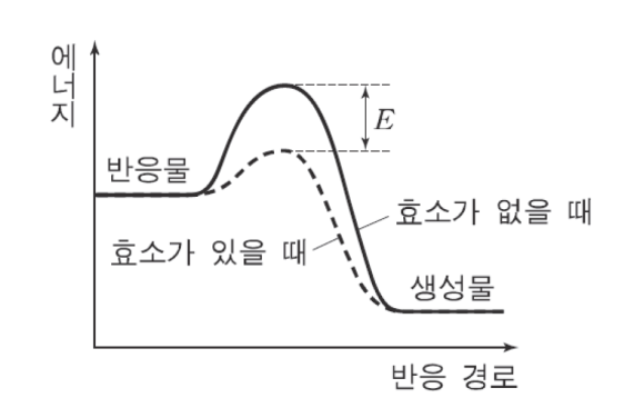 ③유기 촉매(유기물로 구성된 촉매)로서 활성화 에너지를 감소시키고 반응 속도를 증가시킨다(점선). E는 활성화에너지가 감소한 만큼을 의미한다.