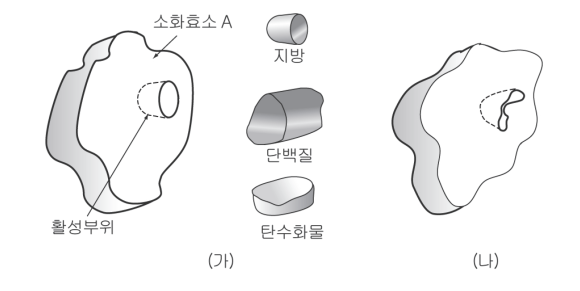 아래 그림 가목은 소화효소 A와 지방, 단백질, 탄수화물의 형태를 모식적으로 나타낸 것이고 그림 가목은 온도를 70℃로 높였을 때의 소화효소 A의 형태를 나타낸 것이다. (나)에서 효소의 활성부위가 바뀌어 기질인 지방과 반응할 수 없게 될 것이다.