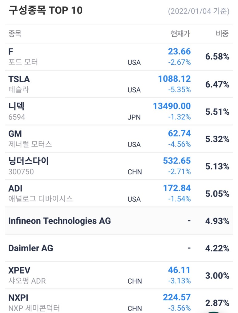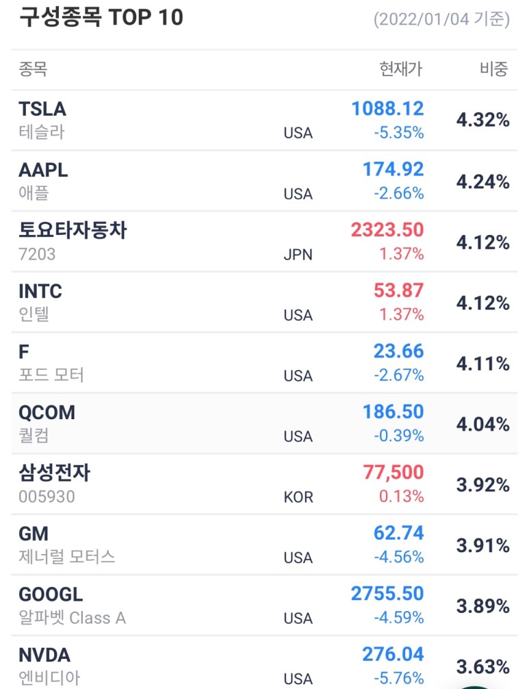 기타 69%가 썩 마음에 들지 않지만 명단 중에는 기아 현대도 포함돼 있다.매우 많은 종목이 있으며 비중은 0.7% 정도로 낮은 편이며 아래 링크에 들어가면 DRIVETF의 세부 종목을 확인할 수 있다.