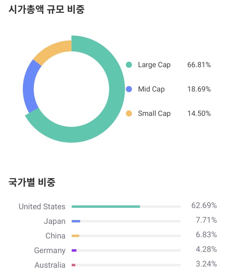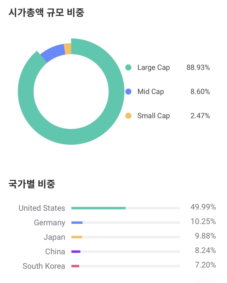 미국 주식 비중이 62.69%, 시가총액 규모가 큰 종목 비중이 66.81%, 테슬라의 비중도 5% 정도로 다른 자율주행 ETF에 비해 비중이 높은 편이다.