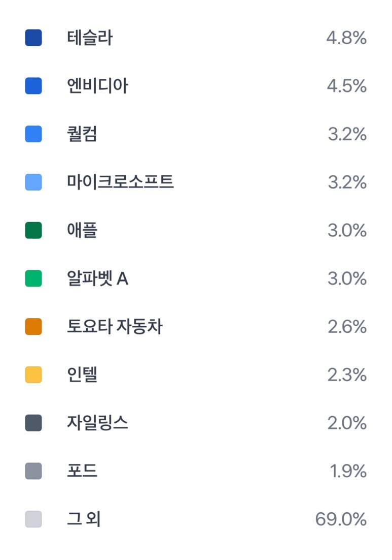 자율주행과 관련된 애플의 비중이 조금 높고, 엔비디아의 비중은 약간 낮은 편이다.