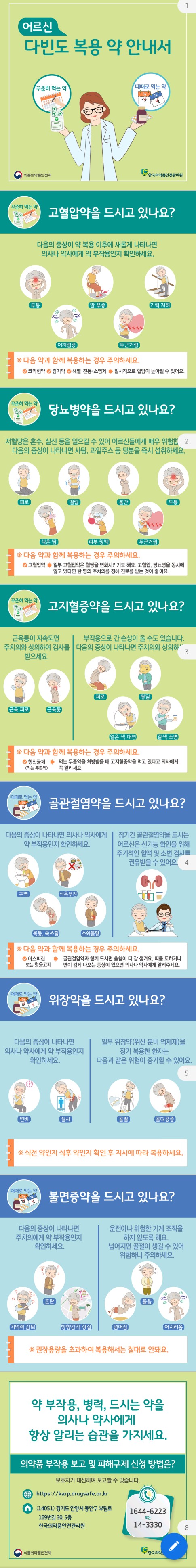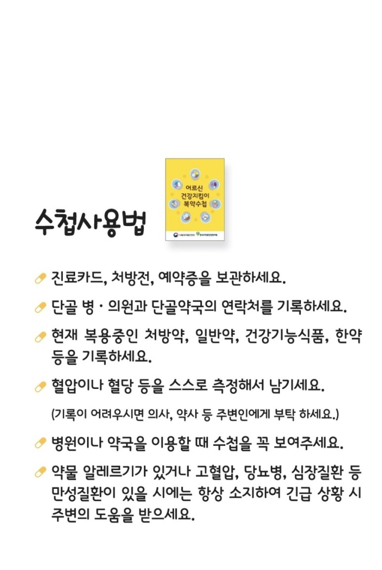 식품의약품안전처가 노인을 위한 복약수첩, 다빈도 복용약 안내서(리플릿, 동영상) 등 유익한 자료를 돌렸죠.