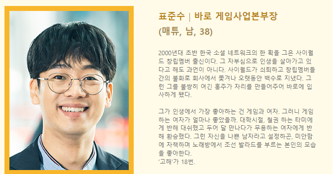 게임사업본부장 표준수=게임사업본부장(매튜 남38)=2000년대 초 한국 소셜네트워크의 한 획을 그은 싸이월드 창립 멤버 출신이다. 그 자부심으로 삶을 살고 있다고 해도 과언이 아니다. 싸이월드가 쇠퇴하면서 창단 멤버 간 불화로 회사에서 쫓겨나 오랫동안 실업자로 살았다. 그런 그를 불쌍히 여긴 홍주가 일자리를 만들어 줘 바로에 입사하게 됐다.