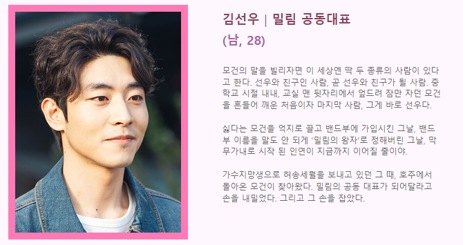 최봉기=최봉기(조셉남28)=모레 서른을 앞두고 있지만 18세처럼 호기심 많고 밝다. 사회부 기자 출신으로 군대의 연장선 같은 남초문화를 견디지 못하고 유니콘으로 이직했다. 이직 첫날부터 타미의 매력에 반해 이직한 지 한 달 만에 타미를 따라 바로 이직한다.