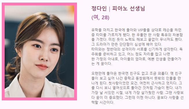 피아노선생님 정다인│ 피아노선생님(여28) 유학을 마치고 한국으로 돌아와 VIP들에게 레슨을 하던 중 타미를 가르치게 됐다. 한 우물을 판 사람 특유의 한가로움을 가지고 있다. 미친 듯이 노력도 하고 끝없이 무너져도 보았다. 그 드라마가 만든 딱딱함이 심성에 배어 있다. 타미와는 정반대의 성격이라 서로를 이상하게 생각한다. 독주회를 준비하다 어느 정도 자리를 잡으면 한 가정의 아내로서, 아이들의 어머니로서 깨끗한 인생을 만들어 가는 게 꿈이다.