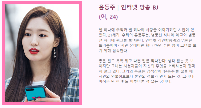 윤동주인터넷방송 BJ 윤동주│인터넷방송 BJ(여24) 별 하나에 추억과 별 하나에 사랑을 말한 시인이 있었다. 21세기 우리의 윤동주는 별풍선 하나에 애교와 별풍선 하나에 윙크를 보여준다. 인터넷 개인방송계의 영원한 말썽꾸러기지만 온에어만 하면 수천 명이 그를 보기 위해 접속한다.
