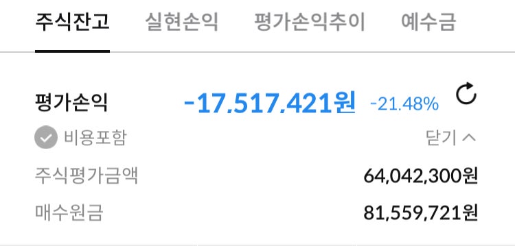 평가손익 : -1,578,269원 수익률 : -24.74% 보유수량 : 500주 매수금액 : 6,378,269원 매입단가 : 12,756원 비중 : 6.58%