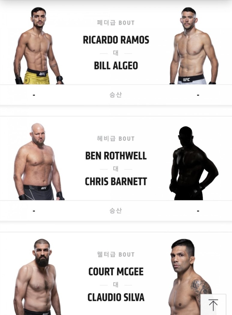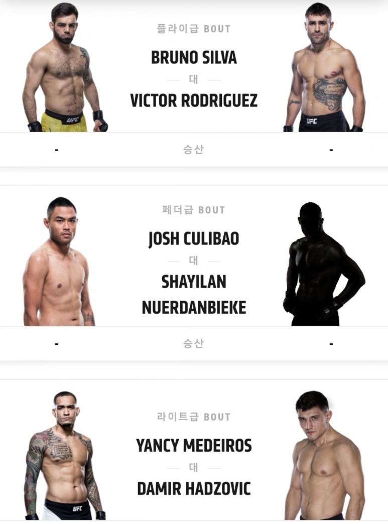 [밴텀급] 히카르도 하모스 [페더급] 반 로즈웰 vs 크리스 버넷 [웰터급] 커트 맥키 vs 클라우디오 실바 [플라이급] 브루노 실바 vs 빅터 로드리게스 [페더급] 조쉬 쿨리바오 vs 샤일란 [라이트급] 더밀 하조비치 vs 얀시