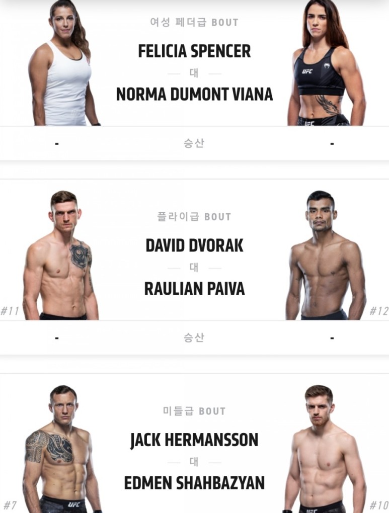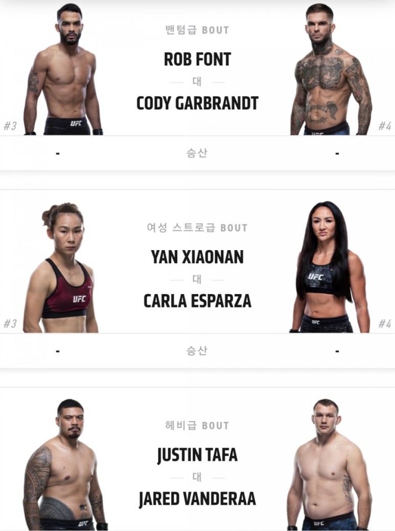 [밴텀급] 로브 폰트 vs 코디 가브란트 [여성 스트로급] 안시아 오난 vs 카를라 에스팔자 [헤비급] 저스틴 타퍼 vs 자레드 반데라 [여성 페더급] 펠리시아 스펜서 vs 노르마 뒤 몽비아나 [플라이급] 다비드 드 보라크 vs 하우리안 파이버 [미들급] 자크 하만센 vs