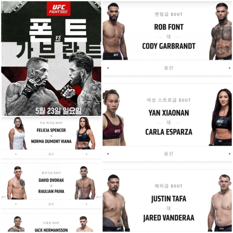 23일(한국 시간) 미국 네바다 주 라스베이거스에서 UFC Fight Night(이하 UFN)가 열린다. 메인 이벤트는 롭 폰트(18승 4패미국)와 밴텀급 전 챔피언 코디 가브란트(12승 3패미국)의 밴텀급 매치다.