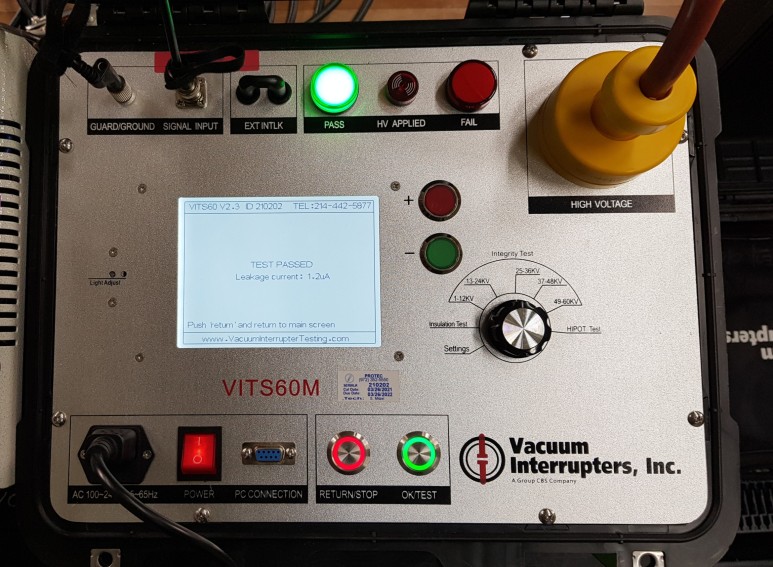 VI 진공도 검사 사진입니다. 일반적으로 기중차단기의 아크 길이는 30ms ~ 150ms 사이에서 소멸하지만 진공(VI) 안에는 전도성이온화된 가스와 용융되거나 기화된 금속물질이 없기 때문에 아크가 2~3ms 미만 발생하므로 3.3kV ~ 38kV까지 광범위하게 사용됩니다.